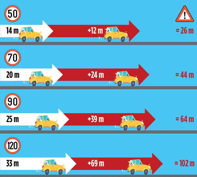 Astuce de calcul : multipliez par trois le chiffre des dizaines pour connaître la distance parcourue chaque seconde. Par exemple, 50 km/h = 15 mètres/seconde. Ce délai, c’est celui que notre cerveau exige pour déclencher l’action.